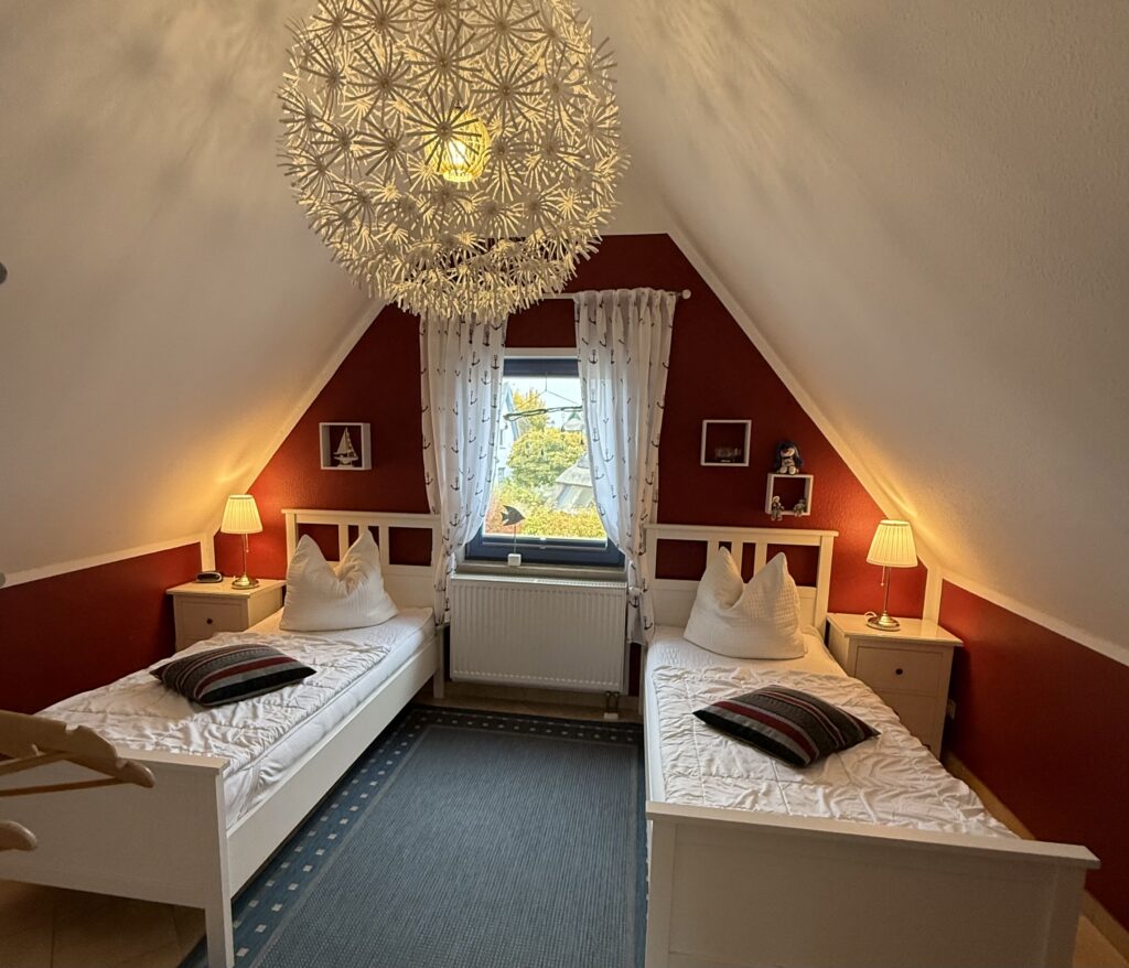Die beiden Schlafzimmer ( mit Wand-Heizkörper) und das Bad mit Dusche (mit Fußbodenheizung) befinden sich im OG und sind mit einer offenen Treppe vom Wohnbereich erreichbar. Alle Fenster sind mit Rollos innen und Fensterläden außen zum Abdunkeln ausgestattet.
